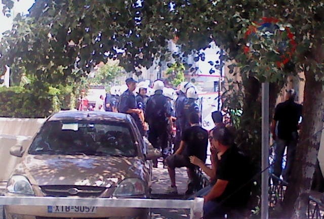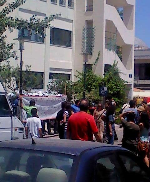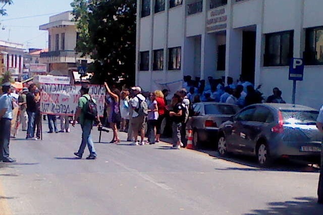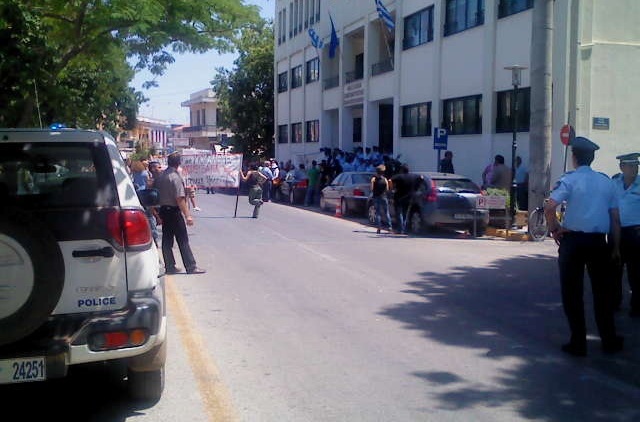 Από τις 2 το μεσημέρι 300 περίπου εργαζόμενοι και αγρότες «εφοδιασμένοι» με αυγά συγκεντρώθηκαν περιμετρικά του κτιρίου της νομαρχίας και αποδοκίμασαν τον υπουργό φωνάζοντας συνθήματα, την ώρα που εκείνος έμπαινε στο κτίριο.